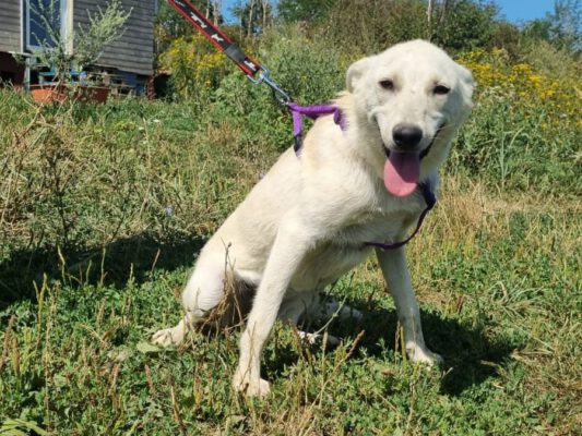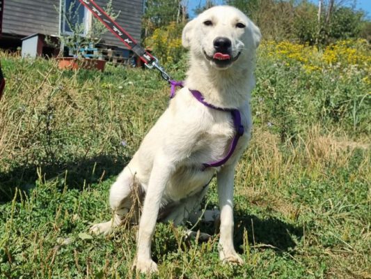 Dit mooie meisje heet Adelle. Adelle is een teefje. Haar geschatte geboortedatum is december 2023. Ze is een middelmaat hondje, ongeveer 45-50 cm schofthoogte.
