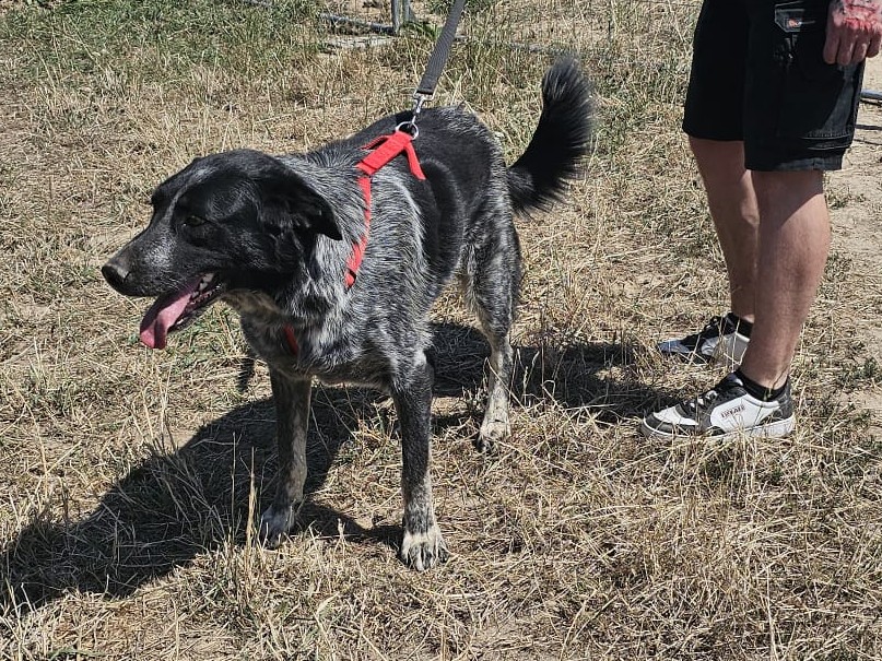 Dit is Caithe. Caithe is een teefje. Haar geschatte geboortedatum is augustus 2023. Ze is ongeveer 60cm schofthoogte en weegt zo een 40 kilo, een prachtige grote dame dus.