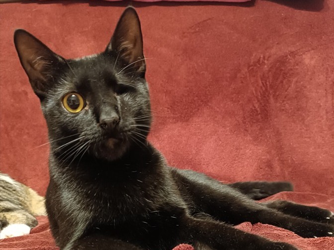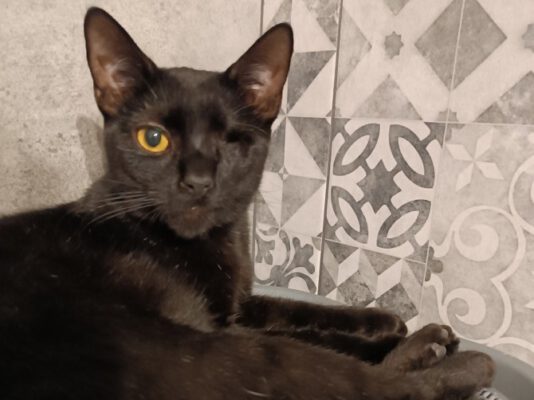 Jojo “praat” graag met zijn zachte, fijne stemmetje en geniet enorm van aandacht. Overdag, terwijl zijn opvangouder thuiswerkt, slaapt hij op schoot of ligt hij dicht tegen Queen aan. Met zijn unieke koppie, zijn grote enkele oog en zijn schattige scheve mond verovert hij snel ieders hart.