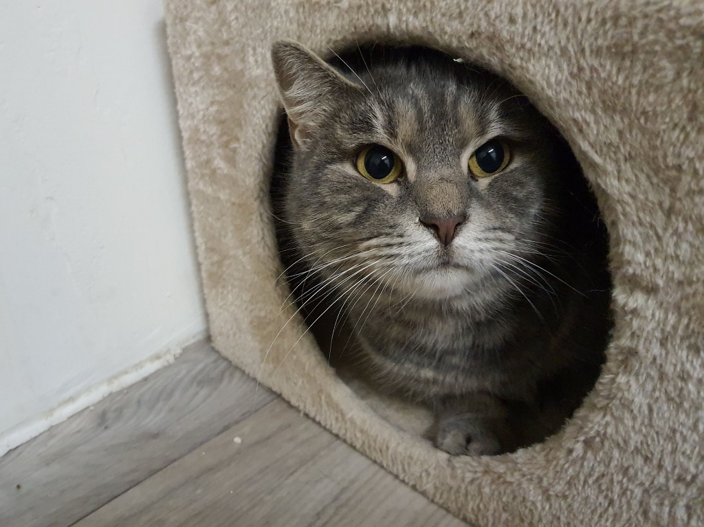 Wij genieten nu van haar aanwezigheid, maar hopen voor haar dat ze maar eventjes bij ons hoeft te zijn en dat we gauw lieve baasjes voor haar vinden. Ze is heel zachtaardig, maar zal in het begin een beetje verlegen zijn. Daisy kan goed met andere katten, maar zou ook in een huisje waar ze de enige poes is, kunnen aarden.