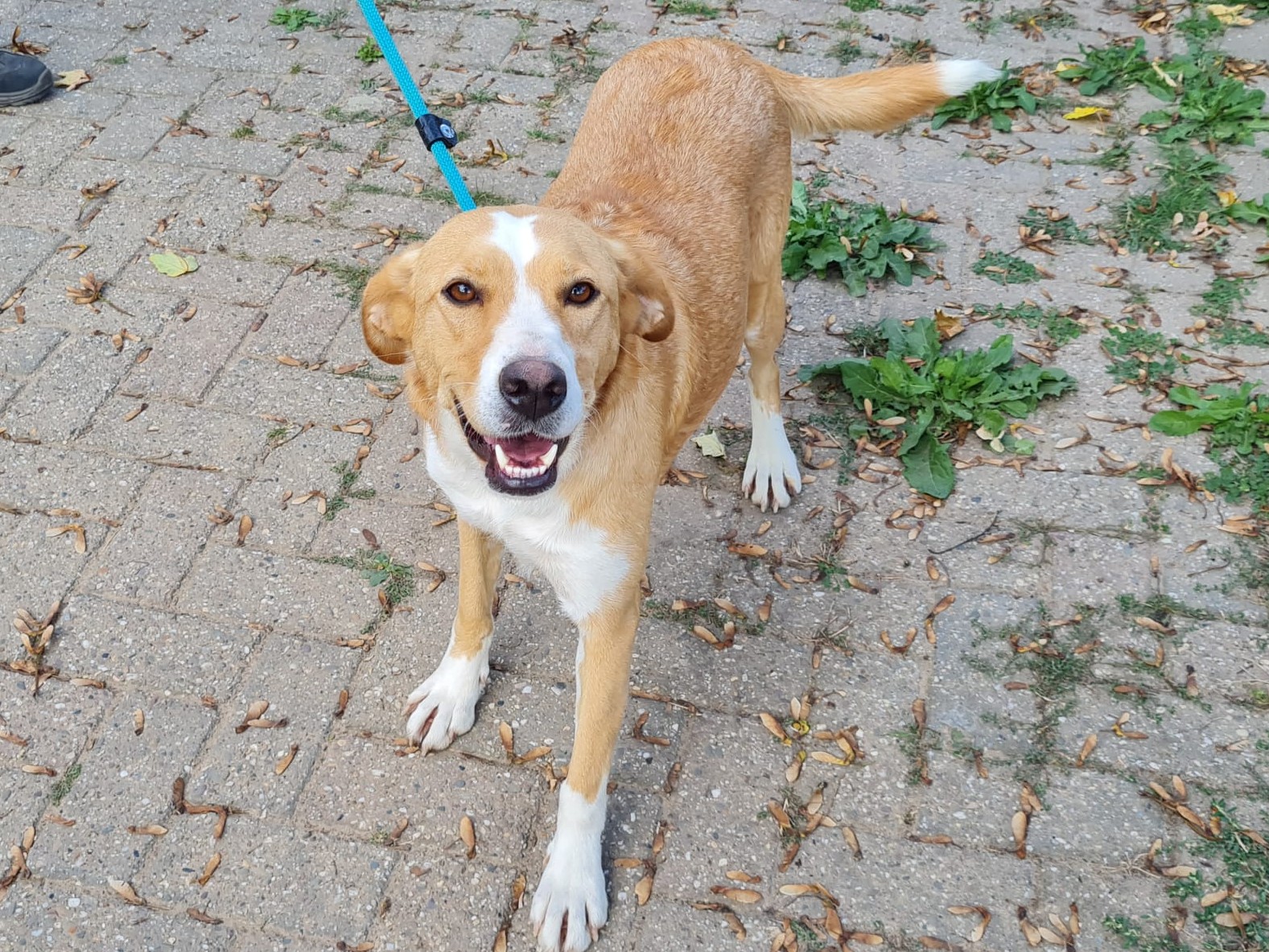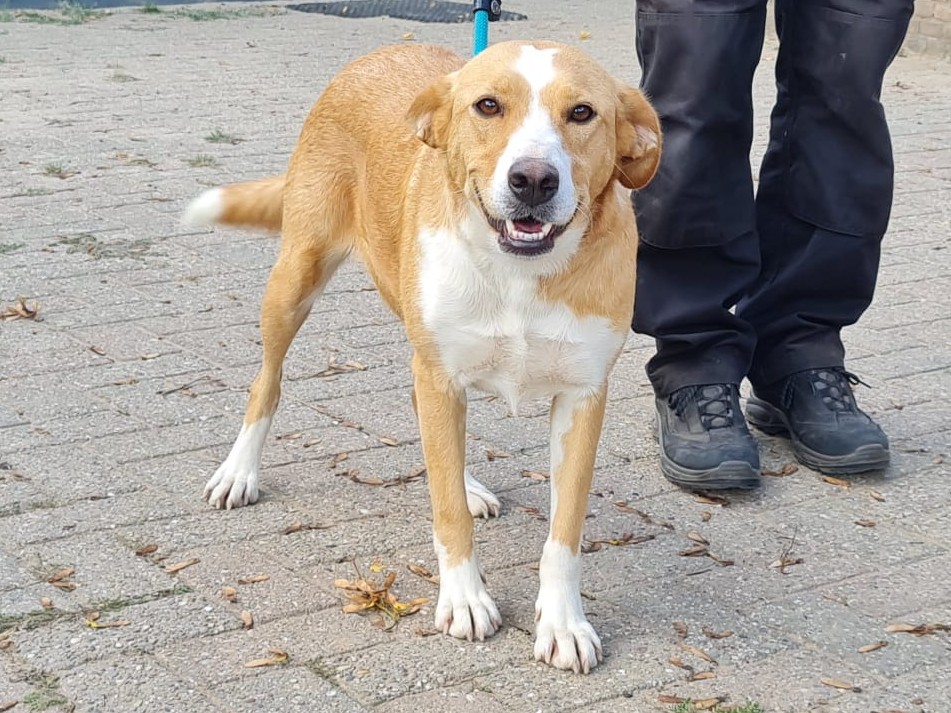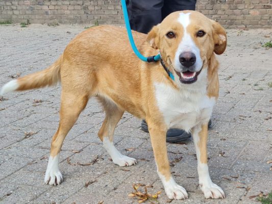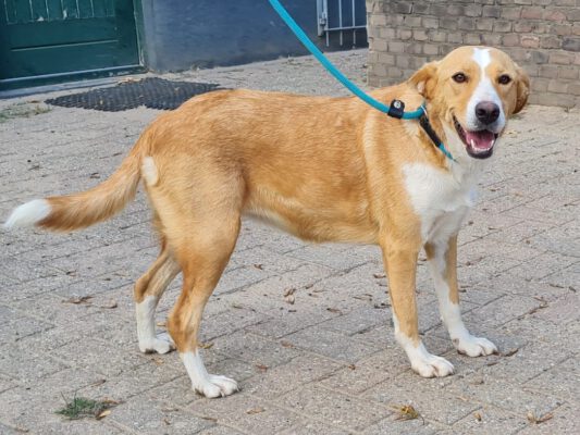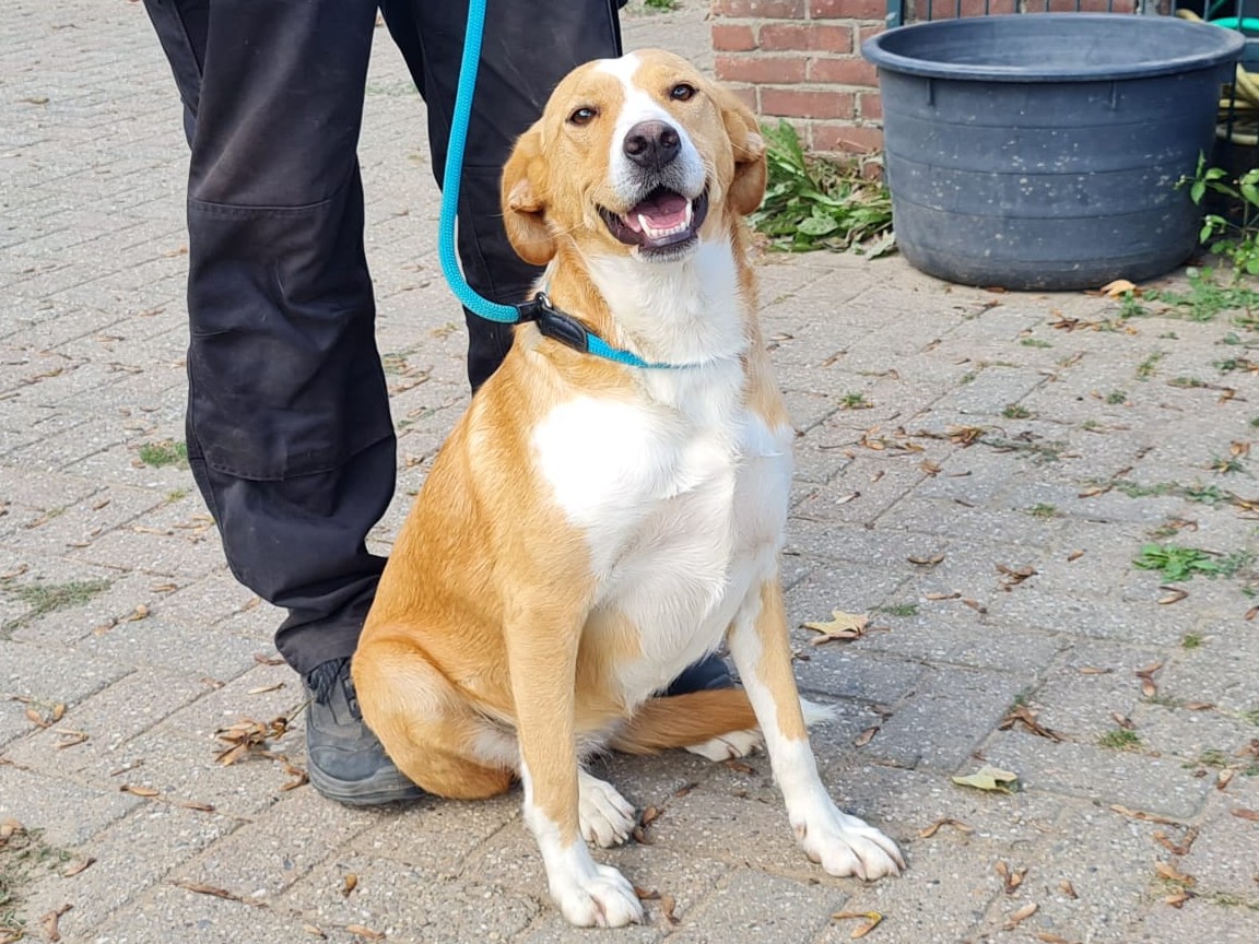 Deze mooie dame heet Rosita. Rosita is een teefje van ongeveer 50 cm schofthoogte. Haar geschatte geboortedatum is augustus 2022.