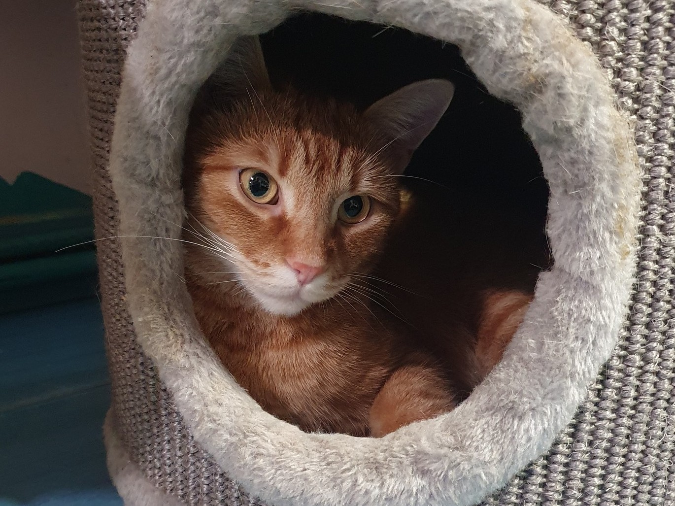 In het begin was Rusty een kleine uitdaging. Hij is een dominante kater, maar niet ruziezoekend: zolang niemand hem uitdaagt, doet hij geen vlieg kwaad. Hij houdt juist van spelen. Als een andere kat agressief doet, verdedigt hij zichzelf, en samen met de ‘smalle bende’ — de drie broers Quincy, Brownie en Norris — had hij in het begin wat conflictsituaties. Daarom moest hij tijdelijk gescheiden worden gehouden en mocht hij alleen onder toezicht kennismaken. Inmiddels is de spanning flink afgenomen; ze kijken elkaar nog wel voorzichtig aan, maar het scherpe randje is weg.